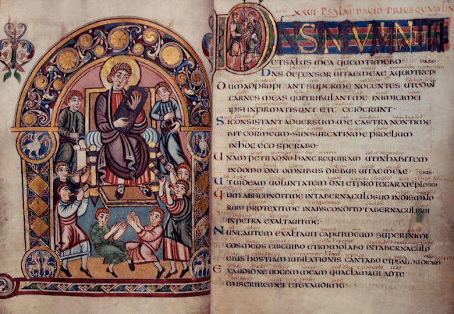 Vespasian PsalterOn the right is the beginning of Psalm 27